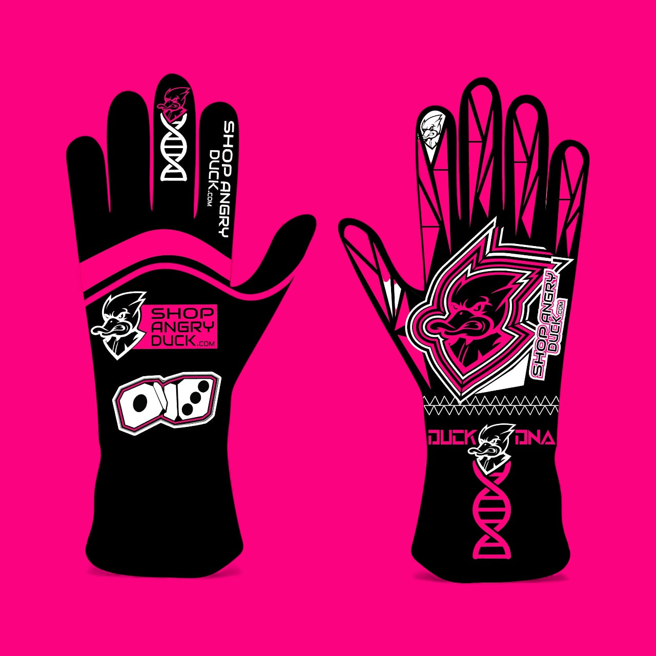 Looking to stand out in a crowd with a new stylish pair of Racing Gloves and Racinig Shoes? We have you covered with our Custom ShopAngryDuck.com DNA racing gloves and shows Package.